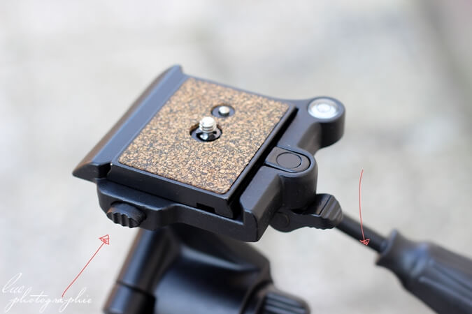 Die Kamera lässt sich sehr leicht auf dem 3D-Neigekopf befestigen. Der Hebel wird nach unten gelöst. Danach wird der Knopf gedrückt und gleichzeitig die Platte heraus geschoben. Nun kann die Kamera mit der Platte verbunden werden. Um die Kamera + Platte auf dem Stativ wieder zu befestigen, schiebt man die Platte einfach wieder hinein und klappt den Hebel wieder nach oben.